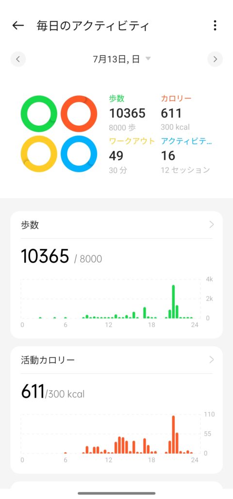 7月14日は10,365歩で、距離に換算すると8.2kmで、活動カロリーは610kcalでした👍