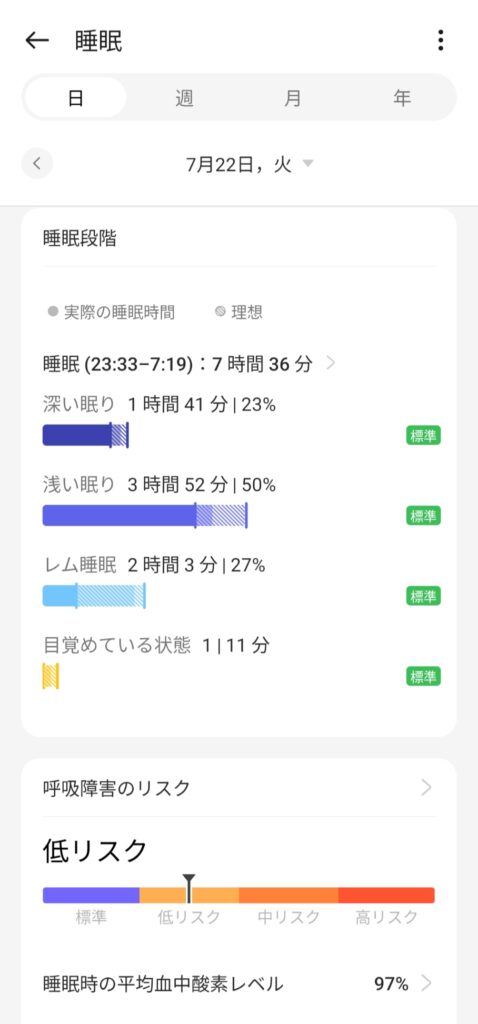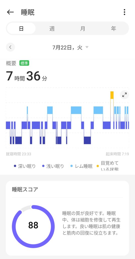 7月22日の睡眠スコアは88で、睡眠の質は良好となりました👍