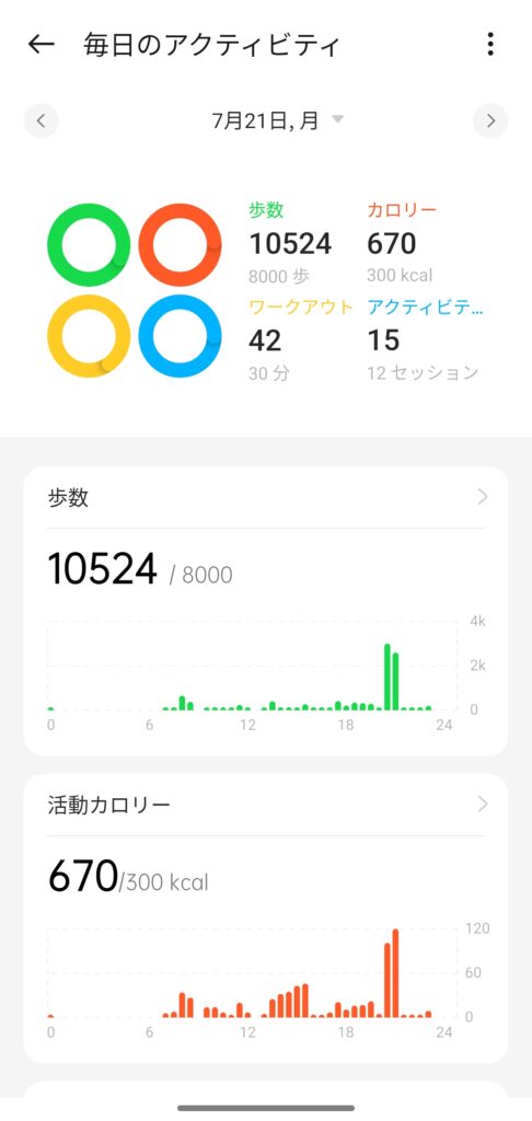 7月21日は10,524歩で、距離に換算すると8kmで、活動カロリーは670kcalでした👍