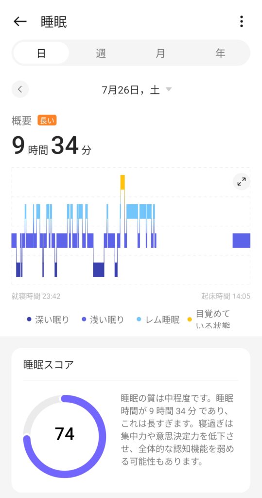 7月25日の睡眠スコアは74と睡眠の質は中程度でした。