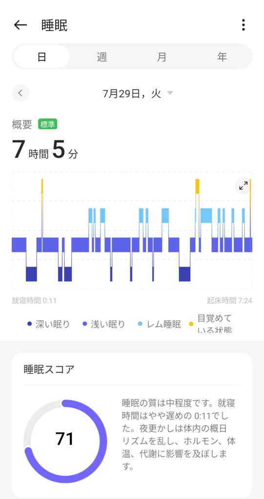 7月28日の睡眠スコアは71と睡眠の質は中程度でした。