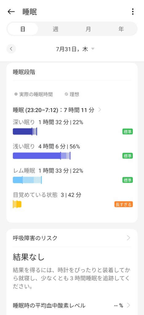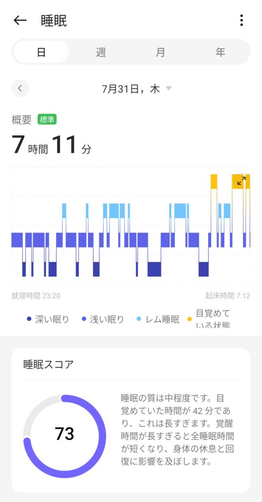 7月31日の睡眠スコアは73と睡眠の質は中程度でした。