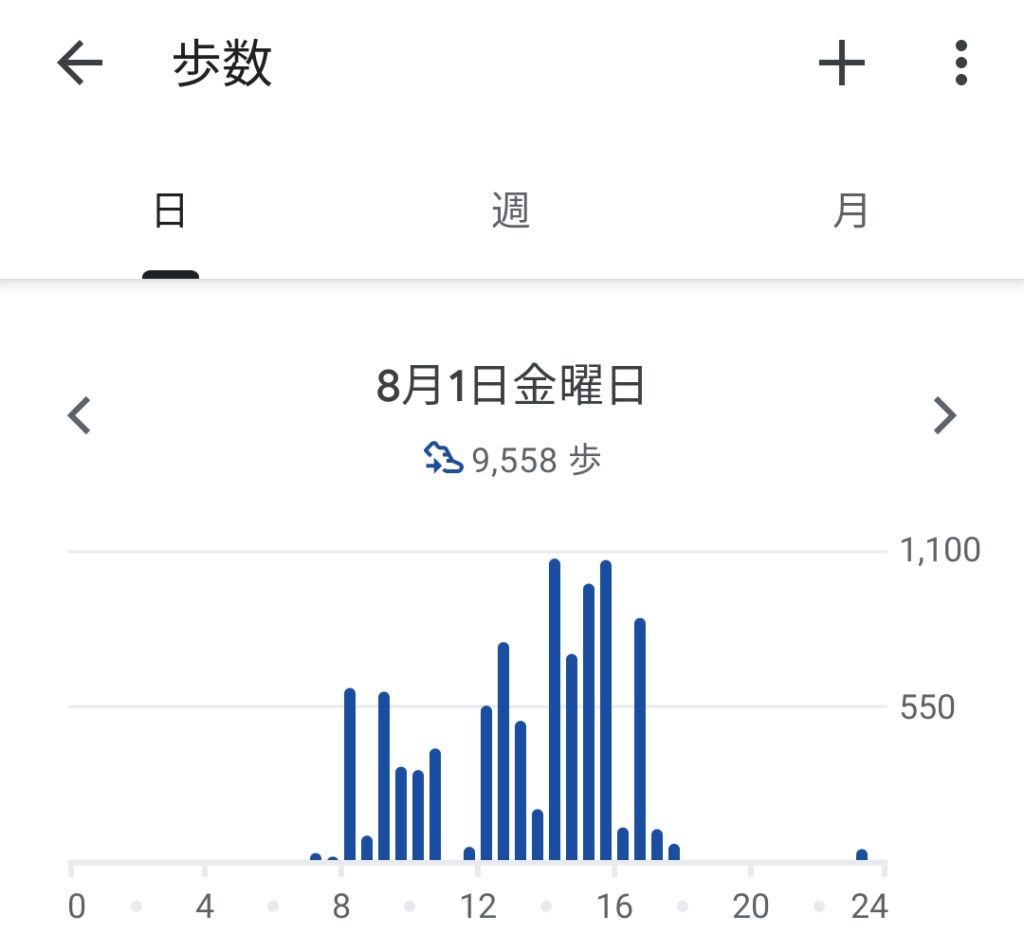 8月1日の歩数は合計で約1万5千歩で、距離換算で約12㎞歩きました👍