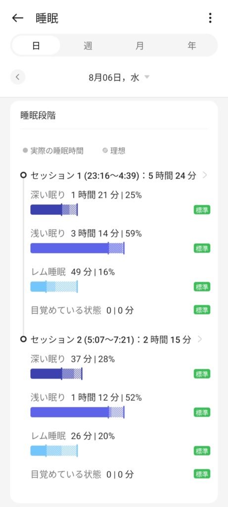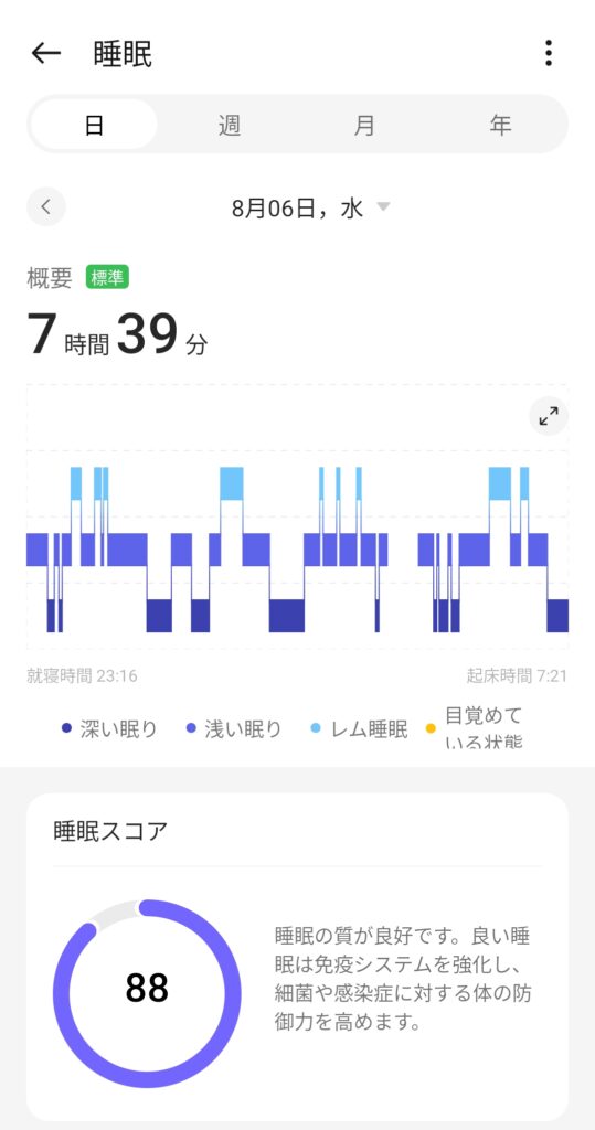 8月6日の睡眠スコアは88で、睡眠の質は良好でした👍