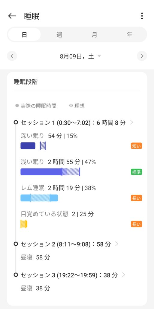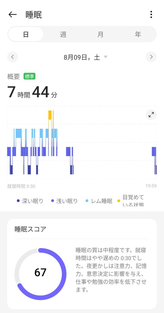 8月9日の睡眠スコアは67で、睡眠の質は中程度でした😑