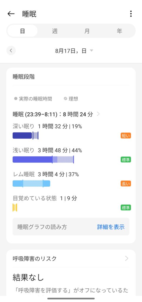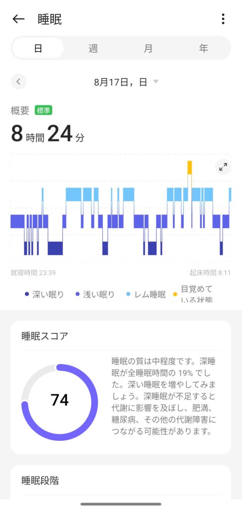 8月17日の睡眠スコアは74で睡眠の質は中程度でした👍