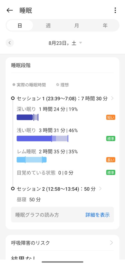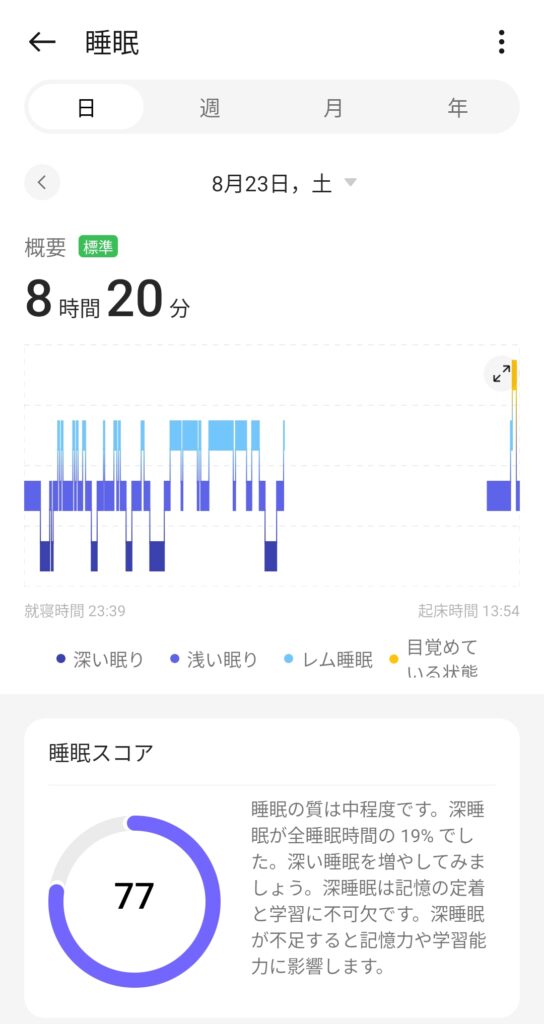 8月22日の睡眠スコアは77で、睡眠の質は中程度でした😑