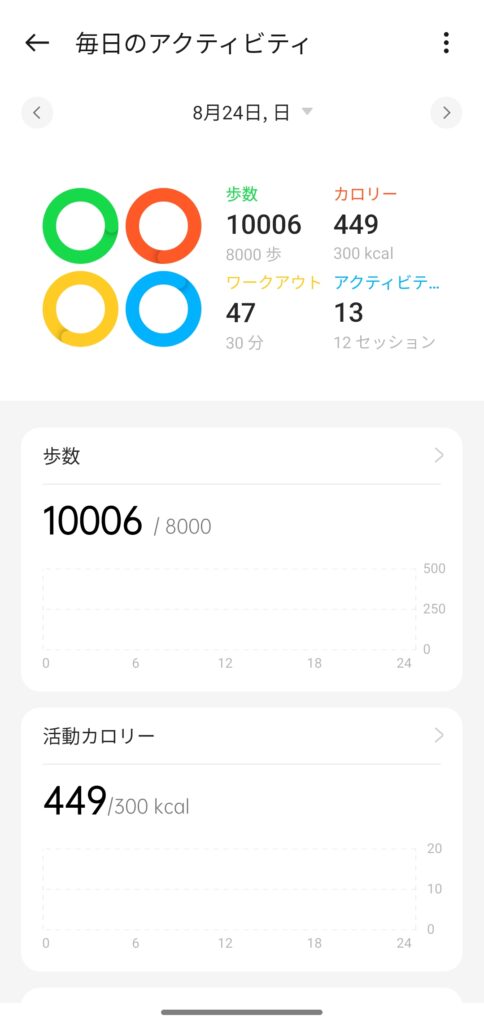 8月24日は10,006歩で、距離に換算すると8kmで、活動カロリーは449kcalでした👍