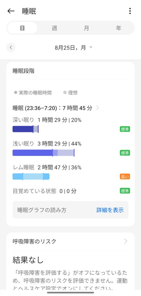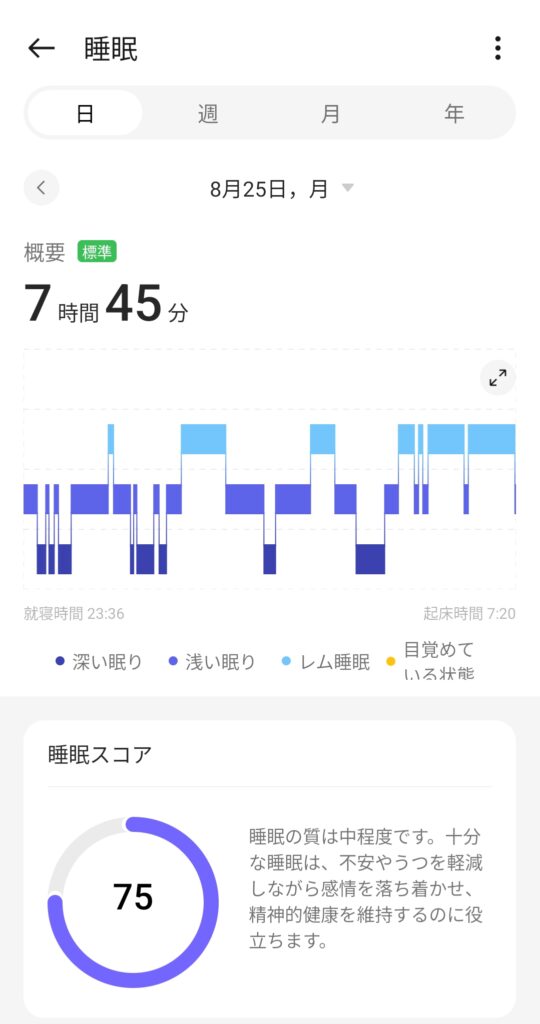 8月25日の睡眠スコアは75で睡眠の質は中程度でした👍
