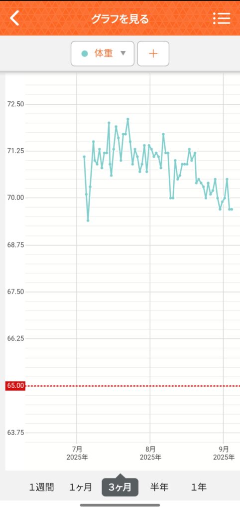 69.7㎏から動かなくなりましたね。グラフを見ると体重は下降傾向ですね。