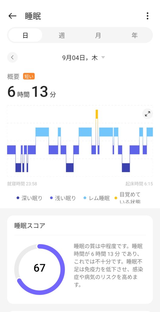 9月4日の睡眠スコアは67で睡眠の質は中程度でした👍