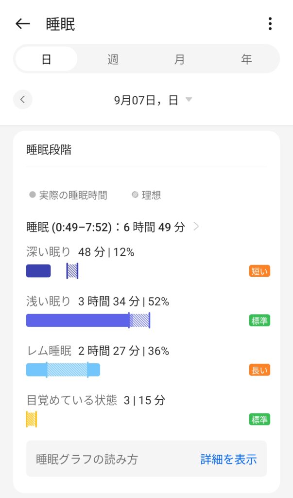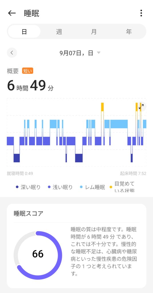 9月7日の睡眠スコアは66で睡眠の質は中程度でした👍