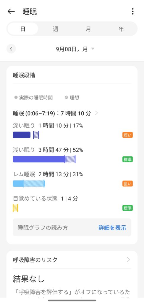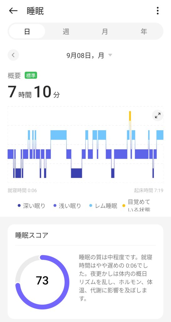 9月8日の睡眠スコアは73で睡眠の質は中程度でした👍