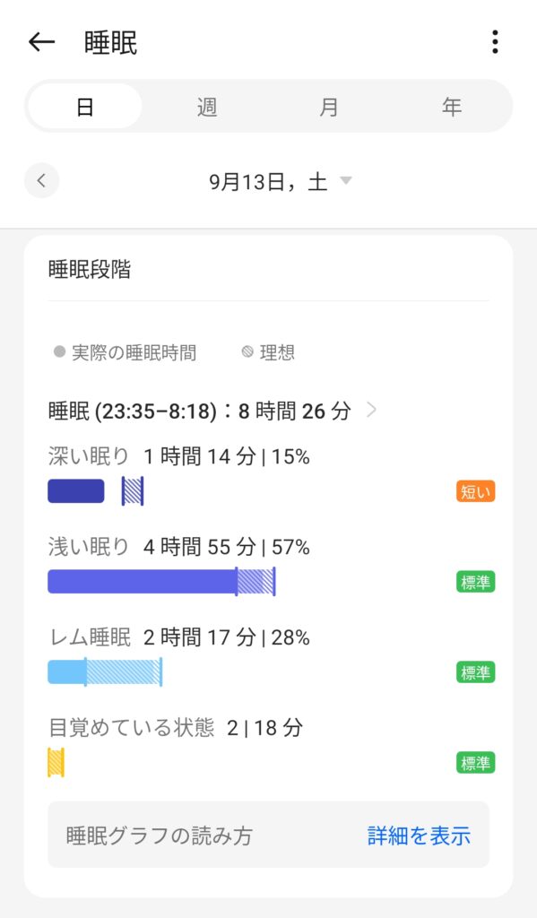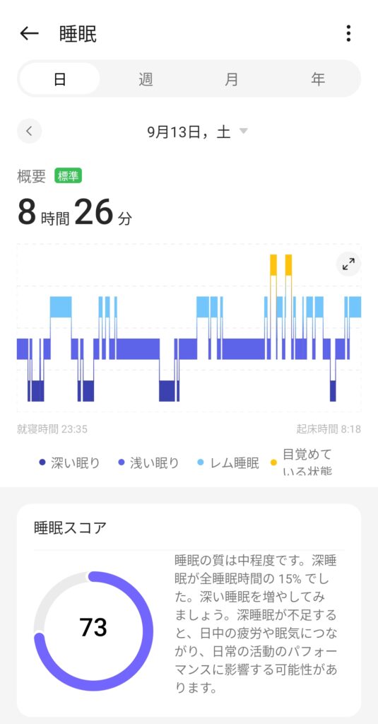 9月13日の睡眠スコアは73で睡眠の質は中程度でした😑