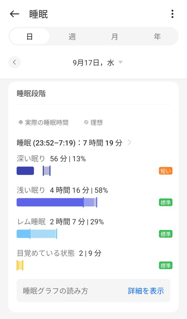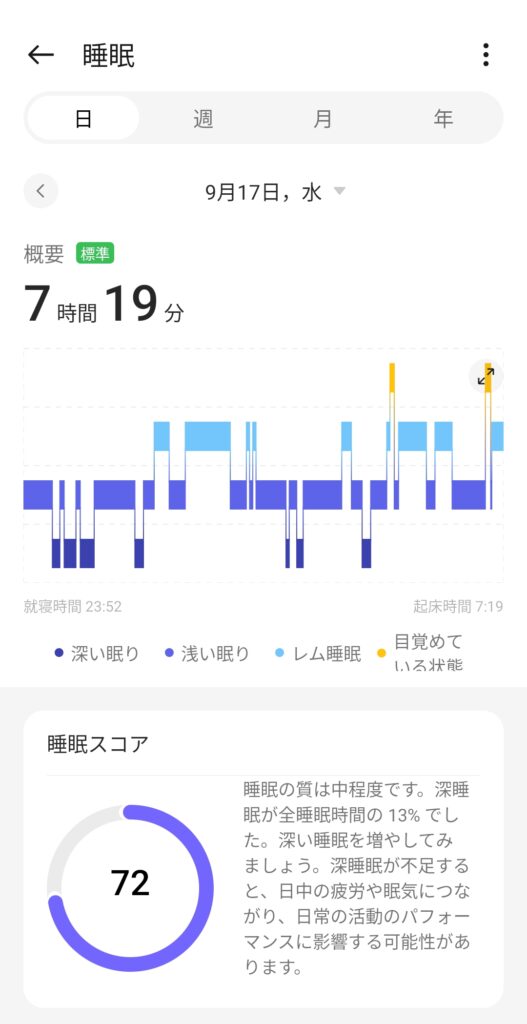 9月17日の睡眠スコアは72で睡眠の質は中程度でした👍