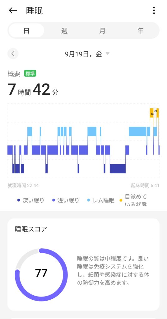 9月19日の睡眠スコアは77で睡眠の質は中程度でした👍