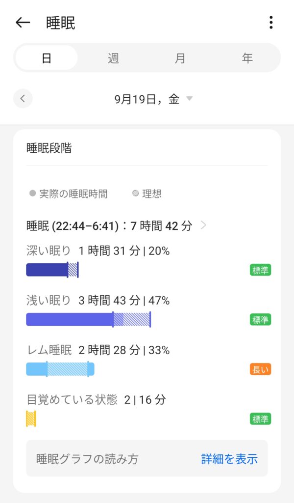 深い眠りが1時間半を超えると頭がすごく冴えます。昨日は深い睡眠が短かったので、日中は頭がぼーっとしてひどい状態でした(´;ω;`)
