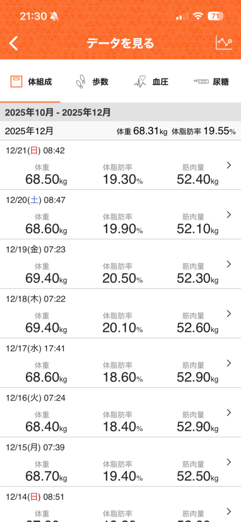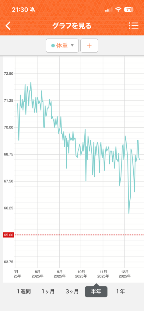 68~69㎏台で推移していて、体重に大きな変化はありません。
