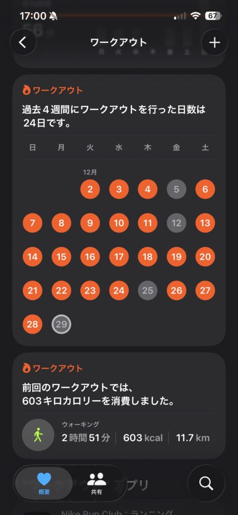 12㎞を休みなしで歩くとさすがに疲れますね。。。ですのでその日は夜ウォーキングは休みました。