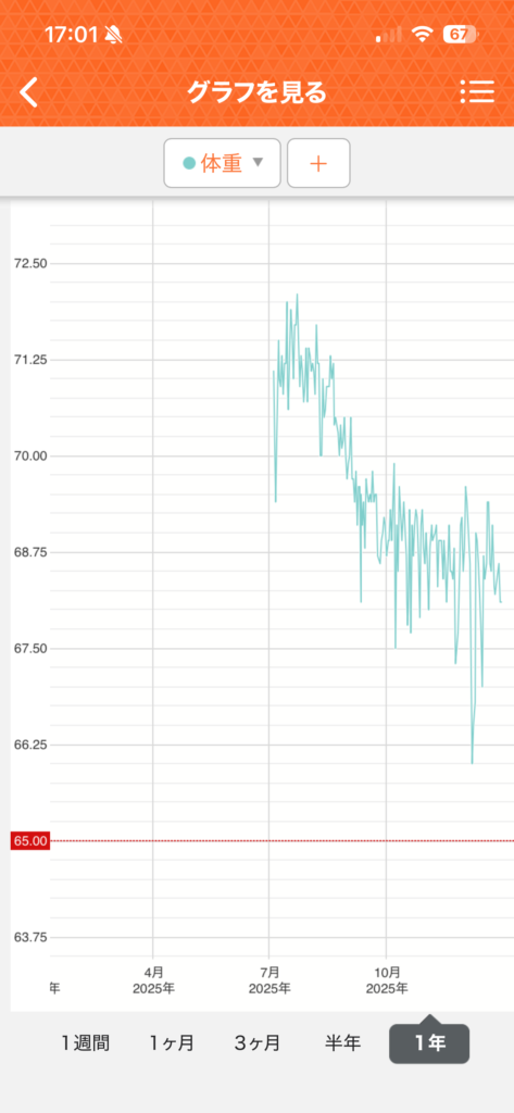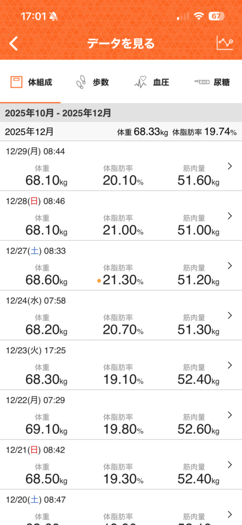 68~69㎏台で推移していて、今週も体重に大きな変化はありません。